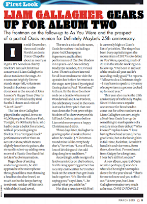 Non che una reunion con Noel al momento sia in cima alla lista delle prorità di Liam. Il cantante è stato impegnato a capitalizzare lo slancio del debutto da solista del 2017 con As You Were, trascorrendo la maggior parte del 2018 in studio a lavorare al suo seguito. "Sono entrato e uscito dallo studio per tutto l'anno e suona davvero molto bene", rivela. "Mi piacerebbe pubblicare un singolo natalizio. Dovrò parlare con il mio esercito di compositori per sfornarne uno entro l'anno prossimo".